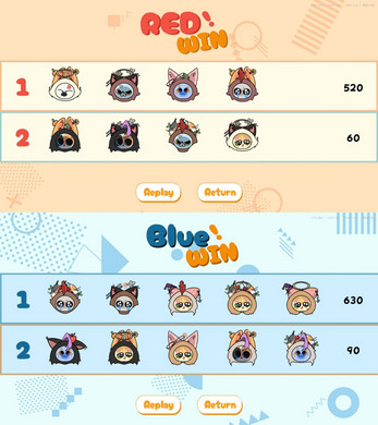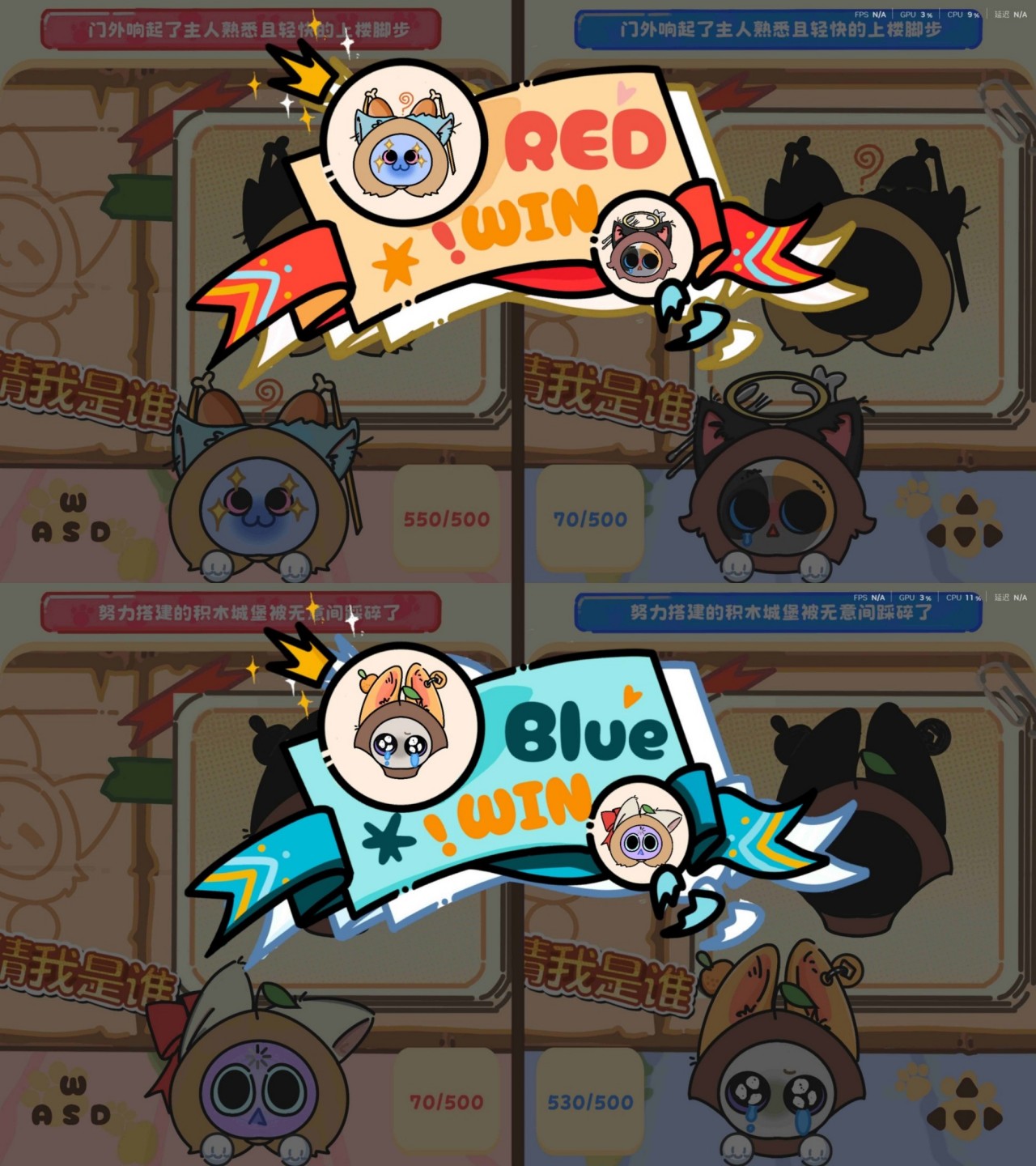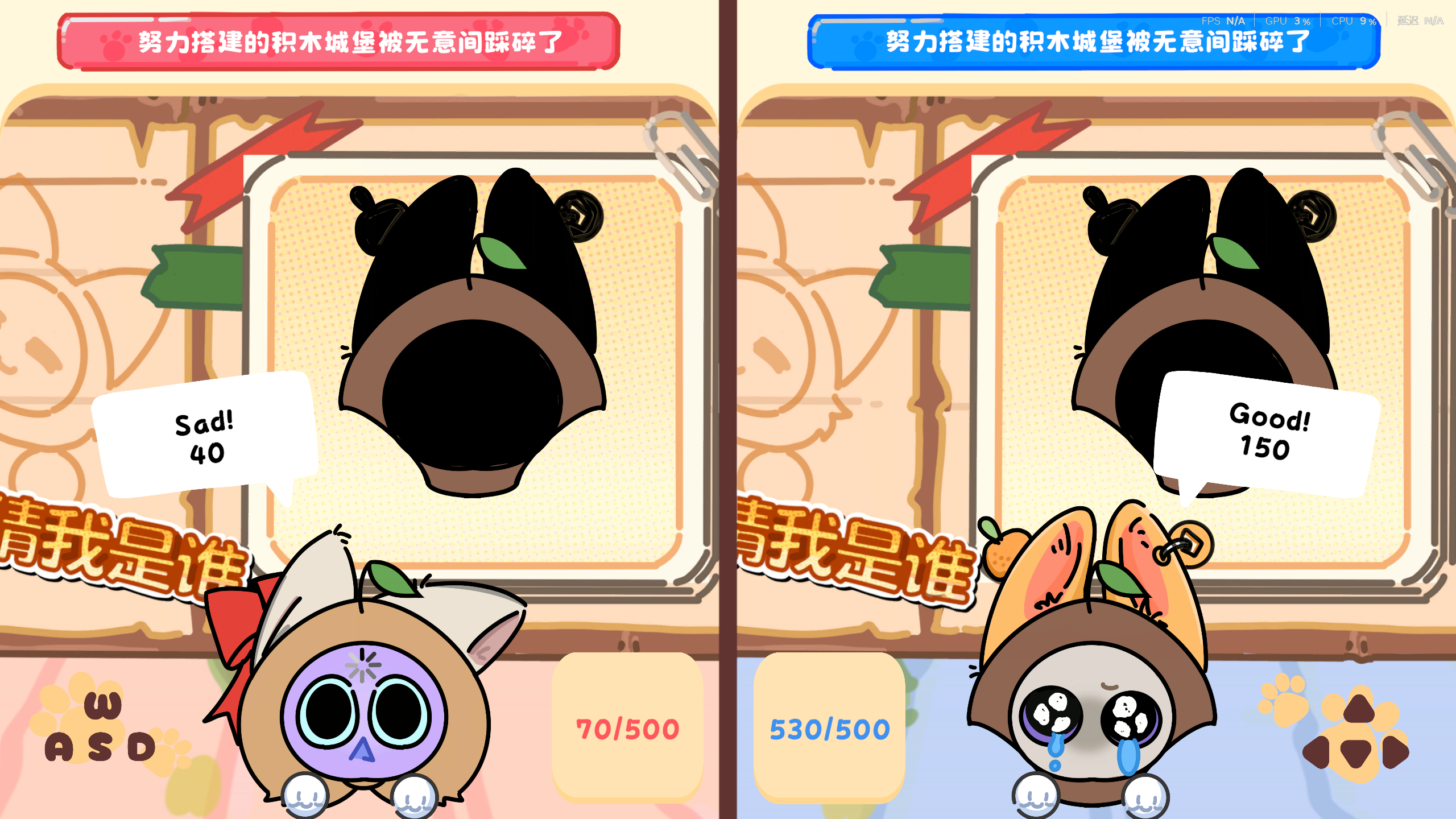 Shape Matching:Red Player uses [W/A/S] and Blue Player uses [↑/←/↓] to switch hair, ears, and face shapes to perfectly fit the approaching silhouette wall.